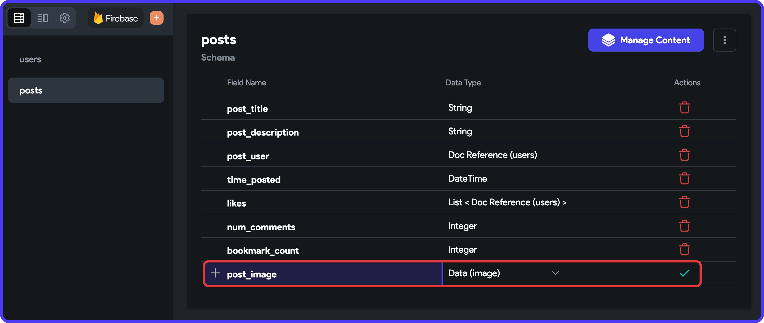 - Now, you can use this new data type while defining fields inside a Firestore collection. Create a new field inside the users collection with name "photo" and Data Type > Image.