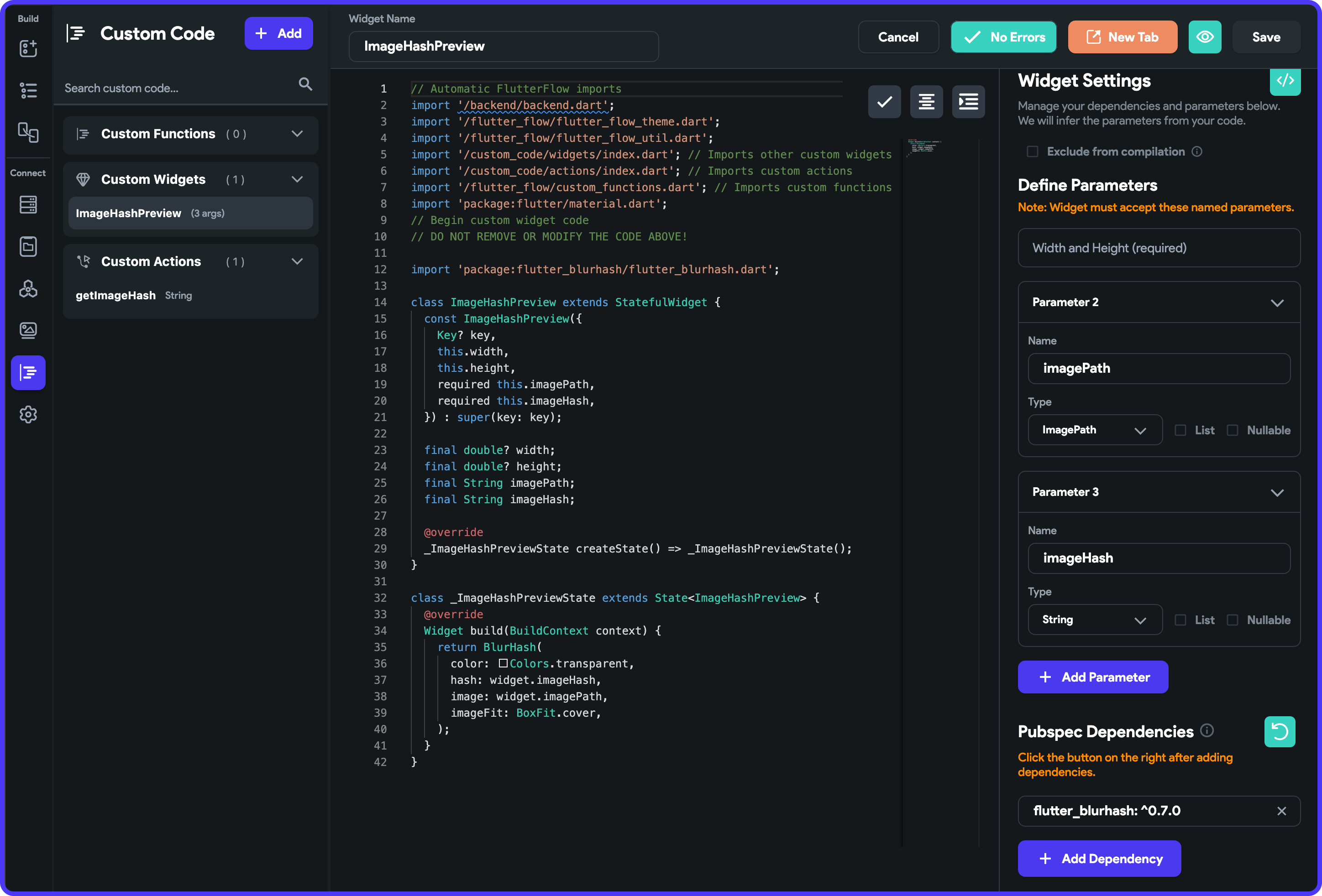 You will mainly require just two custom codes, one custom action & one custom widget, to implement BlurHash in FlutterFlow:
