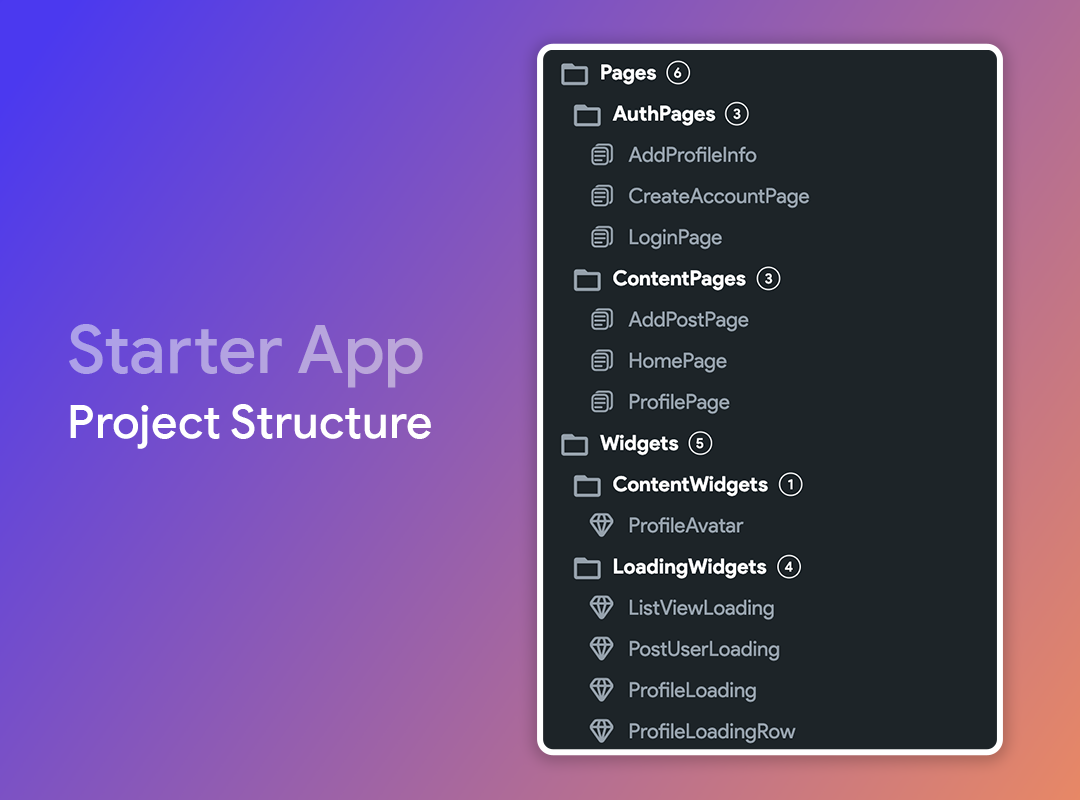 The starter app consists of six main pages and a few components, some of which we use while the backend query is in progress as loading widgets. The project is structured in these folders: