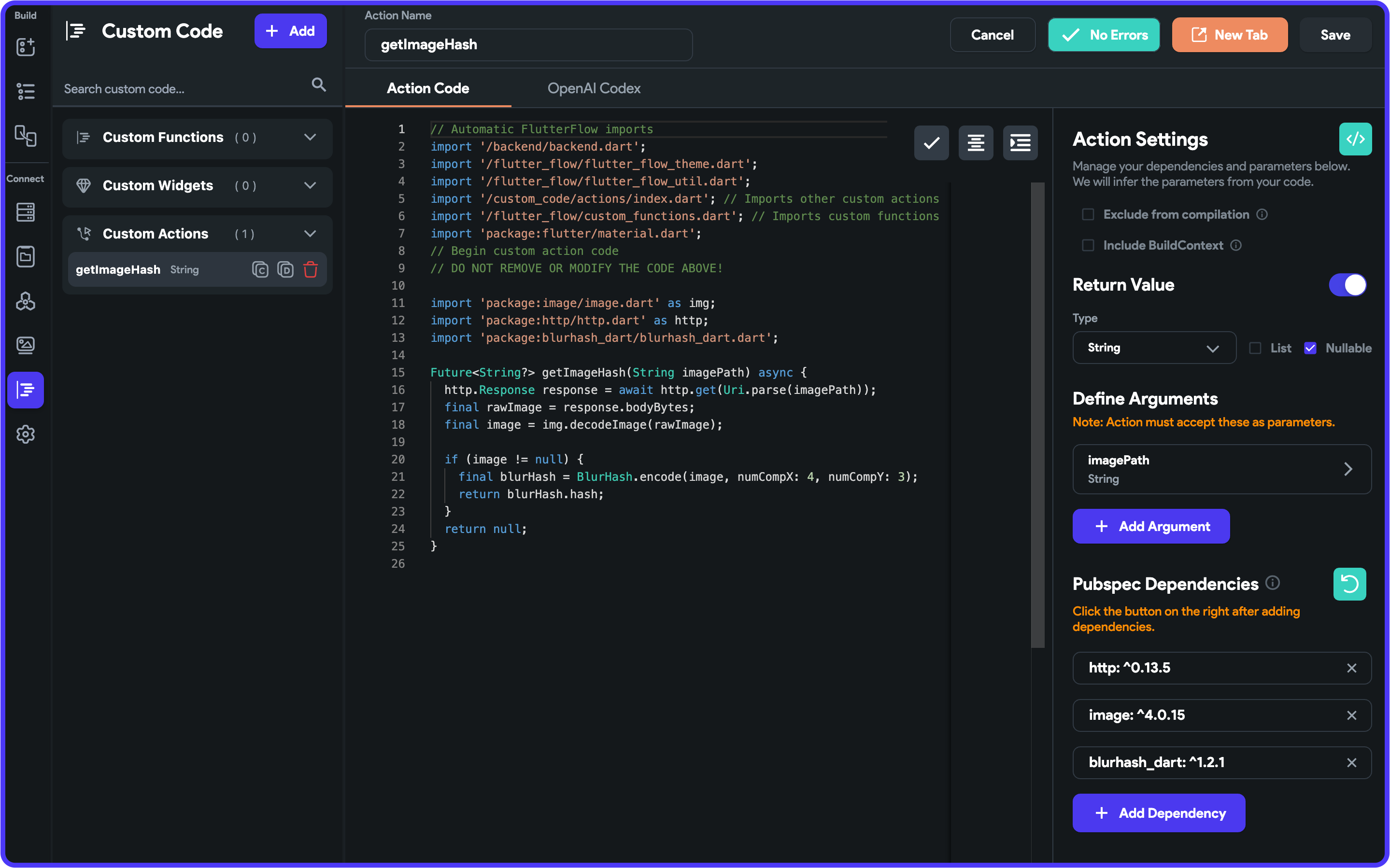 Let's define a custom action called getImageHash that will just take the image path and return the generated hash as a string. We will use a package called blurhash_dart for encoding the image to a hash.