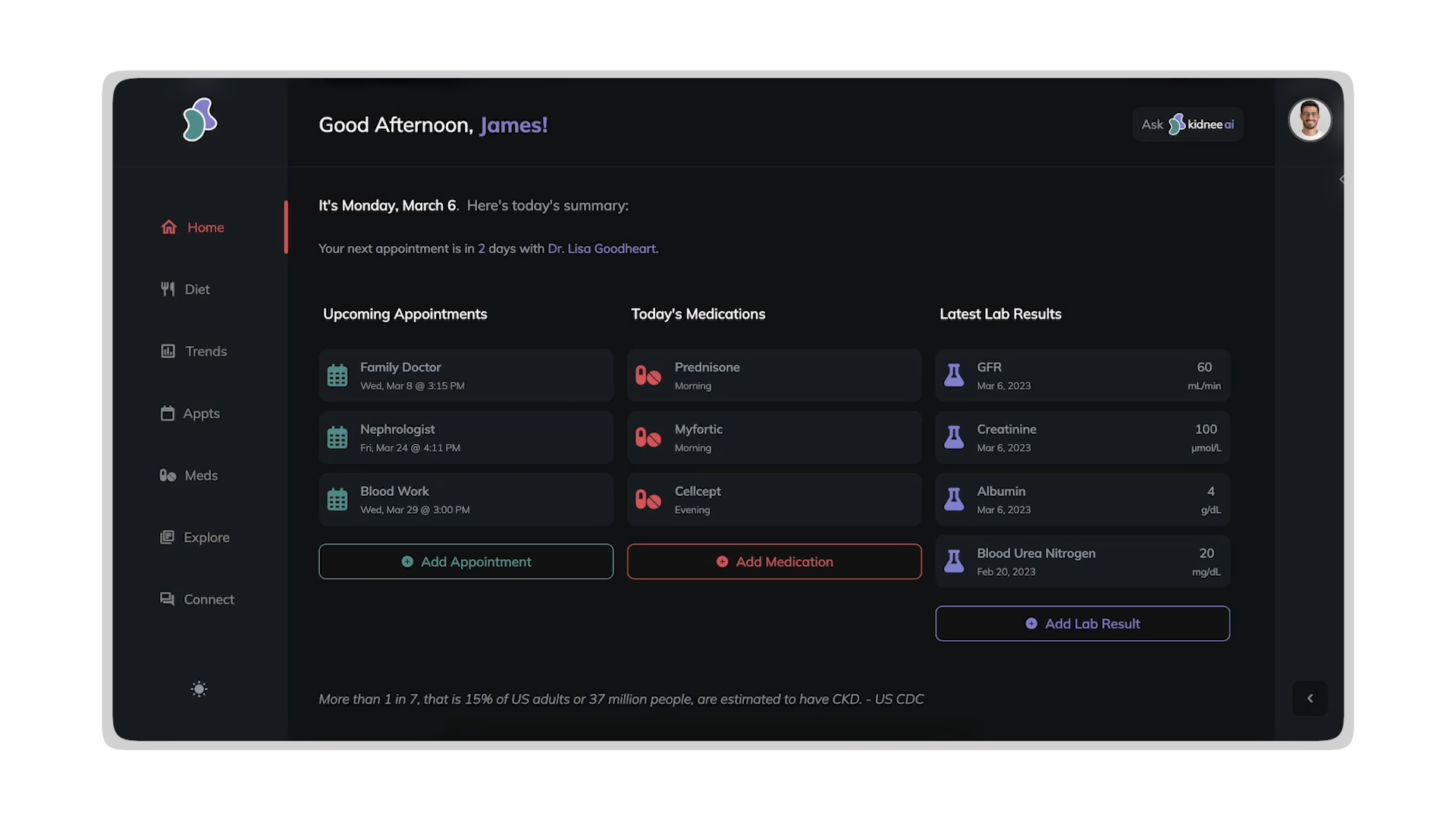 - HomePage: The Kidnee app offers a user-friendly dashboard that provides a summary of a user's day, with respect to their diet and medications. The app also gives a snapshot of the users’ most recent lab results and upcoming appointments.