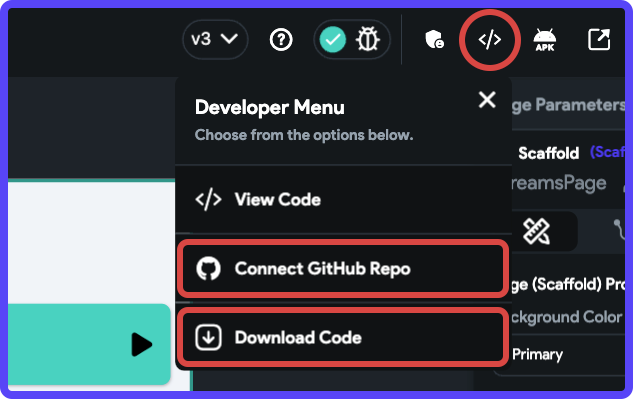 1. Click on the Developer Menu button present on the Tool Bar (top menu), and select Download Code.