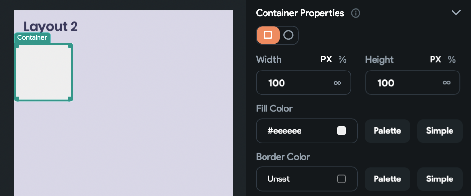 When you drag a new Container widget onto the canvas, by default, it has a height and width of 100 pixels.