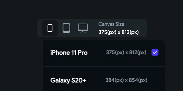 To choose the canvas size according to a device screen size, go to the Canvas Size section (present in the top-left of the screen inside the Tool Bar). You will find three types of device sizes (mobile, tablet, and desktop); click on the mobile icon, and select a device from the list.